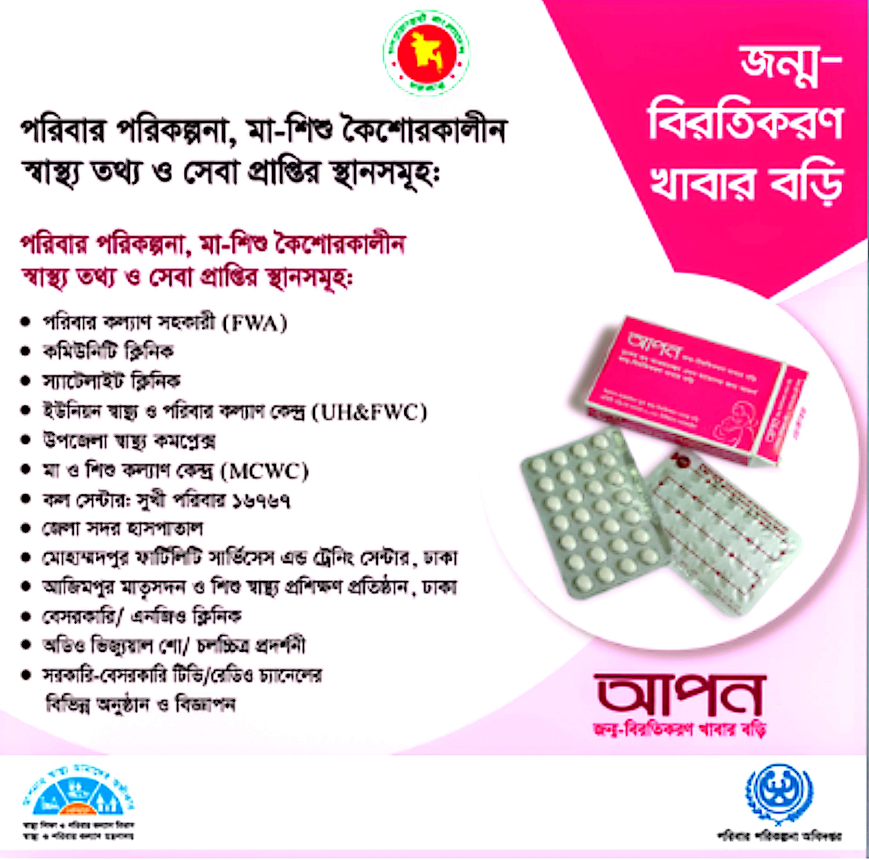 কন্ডম বা পুরুষ স্থায়ী পদ্ধতি বা মহিলা স্থায়ী পদ্ধতি শুধু মাত্র প্রজেস্টরন সমৃদ্ধ খাবার বড়ি #আপন# গ্রহনকালীন সময়ে বা শেষ হওয়ার সাথে সাথে গ্রহন করতে হবে।